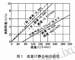 图1是哈里伯顿公司高灵敏度流量计静态响应曲线。从图1可以看出,该仪器在水中的启动速度为3.5ft/min,在气中的启动速度为50ft/min。哈里伯顿公司高灵敏度流量计在水中的测量精度为lft/min,由此得出该仪器在水中测量精度与启动速度的关系为1:3.5。据此估算,该仪器在气中的测量精度约为50/3.5=14ft/min。进而得到,此仪器在水中的测量精度与气中测量精度的比值约为1:14。