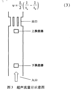 如图3所示。设两个换能器之间的距离为L,声波的传播速度为C,流体的速度为v,如果仪器静止,则声波向上传播的时间为