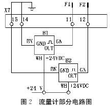 根据用户手册可知Q1和Q2的流量值〔1/min〕=所测频率值〔Hz〕×0.083。根据流量计部分电路图(见图2)可知:流量计B1的针脚14接地,针脚,11接输出信号线F1;流量计B2的针脚15接地,针脚12接输出信号线F2。用万用表的Hz档实测针脚11,其读数是,185Hz,如图3所示,这表明流量计B1是正常的。同理用万用表的Hz档实测针脚T2,其读数是0Hz,B1和B2的电压值24V,正常,这说明流量计B2已经损坏。观察高频发生器的数据流量Q2确实为0,于是产生流量过低的报警。