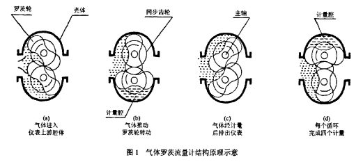 气体罗茨流量计是一种容积式流量仪表。当气体通过流量计时,在入口和出口间产生的压差,作用在与高精密同步齿轮联结在一起的一对罗茨轮上,从而驱动罗茨轮旋转。在这期间,罗茨轮与壳体内壁和压盖之间形成的密闭空间——计量腔周期地充气和排气。罗茨轮的转数与通过流量计的气体体积量成正比。罗茨轮的旋转经磁耦合器传递给机械计数器(或输出流量脉冲信号),从而累积流经计量腔的体积量实现计量的目的。其原理如图l。