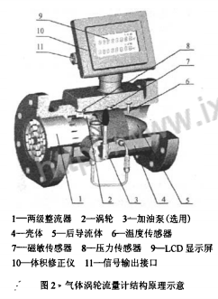 香蕉视频三级是速度式流量测量仪表。当流体流入流量计时,在前导流体(或整流器)的作用下得到整流并加速,由于涡轮叶片与流体流向成一定角度,此时涡轮产生转动力矩,在克服摩擦力矩和流体阻力矩后,涡轮开始旋转。在一定的流量范围内,涡轮旋转的角速度与流体体积流量成正比。根据电磁感应原理,利用磁敏传感器从同步转动的参考轮上感应出与流体体积流量成正比的脉冲信号,该信号经放大、滤波、整形后送入智能体积修正仪,与温度、压力等信号一起进行运算处理,分别显示于LCD屏上。其结构原理图如图2。