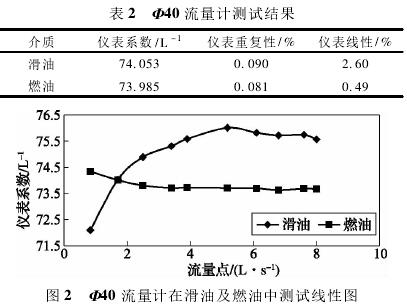 依据表1测试数据,经计算可得,Φ40流量计在滑油及燃油中测试结果如表2所示,测试线形图如图2所示。