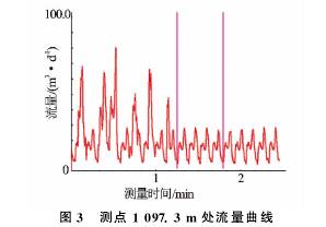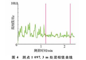 T-××-××1井是大庆油田采油五厂1口水驱产出井,采用阻抗式含水率计在该井进行了测试。图3、图4分别为测点深度1097.3m测量的流量及混相值曲线图。2min的采样时间内,流量及混相值曲线波动剧烈,明显受井下产气影响,进行平均值计算时只能取后半段较平稳的数据,因此,测试时需延长测量时间。录取不同范围数值时流量及含水率测量差值较大,流量平稳段为14.81m3/d,高值时达到23.52m3/d;取不同测量段的混相值时测量含水率*大相差12%。重复测量得到了相同的测量结果。由此可见,气体对流量及含水率测量产生了非常大的测量误差。