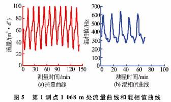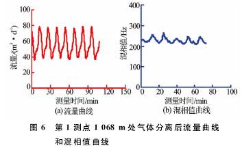 B2-××-××2井是大庆油田采油一厂1口水驱产出井,该井井口计量产液51.72m3/d,取样化验含水率81.8%。采用阻抗式含水率计在该井进行了测试,图5为*1测点深度1068m测量的流量及混相值曲线图。图5的流量曲线表明,流量曲线受气体影响较大,测量流量波动较大,在25~98m3/d之间波动,平均值为58.6m3/d;混相值波动也很大,在280~640Hz之间剧烈波动,平均值图5*1测点1068m处流量曲线和混相值曲线388Hz。该井测量流量为65.8m3/d,测量含水为51.3%,受井下产气影响明显,测量流量明显高于井口计量流量,测量含水率明显低于化验含水率。同时,在该井测井时,使用了仪器上装有气体分离器的阻抗式含水率计在该井进行测试,*1测点的流量及混相值曲线见图6。由于气体分离器将气体分离,未进入测量通道,减小了气体对测量传感器的影响,测量的流量及混相值曲线波动明显减少,流量波动为36~78m3/d,平均值为55m3/d;混相值波动为211~288Hz,平均值为228Hz。测量流量为54.8m3/d,测量含水率为80.4%,与井口计量非常接近。对比测量结果表明,气体对流量及含水率测量造成了非常大的测量误差,已不能进行准确测量。
