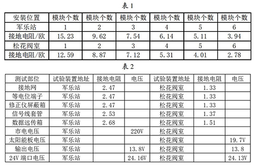 接地网的安装与连接:接地网是整个菜籽油流量计防雷试验比较关键的一个内容,能不能准确的论证试验的有效性,必须保证接地网达到标准的接地电阻,通过对实地地电阻率的测试,初步选择6个接地模块埋设并配用降阻剂使用,边安装边测试直到达到标准值后才引入等电位箱。在军乐站和松花阀室安装模块并测试数据见表1。