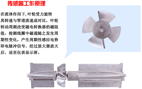 涡轮流量计采用涡轮进行测量。它先将流速转换为涡轮的转速,再将转速转换成与流量成正比的电信号。这种流量计用于检测瞬时流量和总的积算流量,其输出信号为频率,易于数字化。图中感应线圈和永久磁铁一起固定在壳体上。当铁磁性涡轮叶片经过磁铁时,磁路的磁阻发生变化,从而产生感应信号。信号经放大器放大和整形,送到计数器或频率计,显示总的积算流量。同时将脉冲频率经过频率-电压转换以指示瞬时流量。叶轮的转速正比于流量,叶轮的转数正比于流过的总量。涡轮流量计的输出是频率调制式信号,不仅提高了检测电路的抗干扰性,而且简化了流量检测系统。它的量程比可达10:1,精度在±0.2%以内。惯性小而且尺寸小的流量计的时间常数可达0.01秒。
