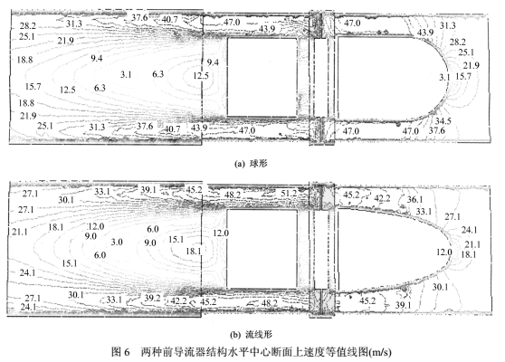 综合图5、6,速度的分布和变化与压力损失的大小密切相关,流线形前导流器不仅使当地的气流速度分布较球形更均匀(梯度较小),还影响其后的流场速度变化程度,从而使各部分的压力损失连锁减小,达到明显降低总压损的目的。