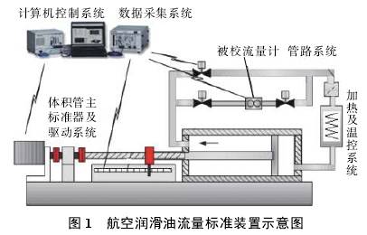图1是航空润滑油流量校准装置示意图。装置采用伺服电机驱动标准计量油缸的结构形式,主要由计量油缸、电机及控制器、滚珠丝杠、直线导轨、校准管路、切换阀门、油箱、控温机组、温度压力传感器、精密光栅尺、数据采集系统、控制计算机等部件构成。装置采用伺服电机驱动标准计量油缸产生标准流量源,计量油缸同时作为容积标准,与光栅配合构成流量测量系统。校准装置通过调节控制介质温度而改变介质粘度。标准装置技术指标为:流量范围:0.5~160L/min;扩展不确定度:0.05%(k=2);温度范围:20~120℃。