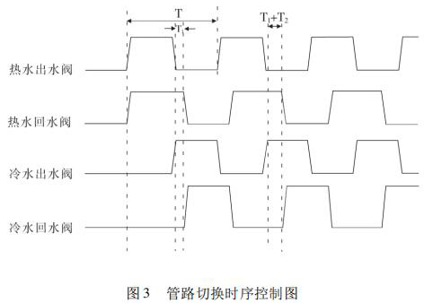 如图 3 所示,初始状态四个开关阀全部关闭。试验开始时,热水出水阀、热水回水阀同时打开, 95℃热水状态下运行 2. 5min 后,1min 内切换至冷水,进行冷水冲击。此时,热水出水阀关闭的同时冷水出水阀打开,由于管路中还有热水,为避免冷热水交叉影响试验结果,热水回水阀延时 T1 关闭;待管路充满冷水,热水回水阀关闭同时冷水回水阀打开, 20℃ 冷水状态下运行 2. 5min。此过程为一个完整的冷热冲击过程,过程中热水出水阀与冷水出水阀同步进行,一个打开另一个关闭,同样地,热水回水阀与冷水回水阀也是同步进行,一个打开另一个关闭。上述过程为一个周期的运行,如此循环 4000 个周期,便可完成 4000 次冷热冲击试验。试验过程中,由于管路切换、阀门响应时间以及延迟时间的不同,且每次回水阀都要延迟打开,每个周期回水阀都会相应延时,且延时时间不同,如图 3 所示,运行*二个周期时热水回水阀总共延时 T1 + T2时间,随着试验运行周期的增加,回水阀延时会增加,可能会导致热水箱或者冷水箱水溢出,故要时刻注意试验运行时冷热水箱水位的平衡,对冷热回水阀的迟滞时间进行相应调节控制,保证冷热水箱水位的平衡,及时避免溢水。