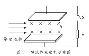 【例1】图5为磁流体发电机示意图。设两金属板间的距离为d,两*板间匀强磁场的磁感应强度为B。等离子体垂直进入磁场的速度为v,单个离子所带的电荷量为q。离子通道(即两*板内所围成的空间)的等效电阻为r,负载电阻为R。则下列判断正确的是( )