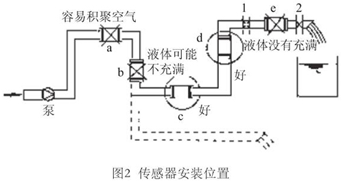 液体流动方向必须与传感器壳体上箭头方向一致。对于能正反向测量的冷冻水回香蕉视频APP下载网站,若方向不一致虽仍可测量,但设定的显示流动正反方向不符,必须改正之。若拆传感器工作量大,也可改变传感器上箭头方向和重新设定显示仪表符号。管道未充满液体主要是管网工程设计或传感器安装位置不妥,使传感器测量管内不能充满液体。应采取措施,避免安装如图2所示a,e位置和以虚线管排放时b位置,改装到c,d位置。