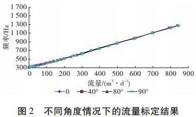 为了考察井眼斜度变化对测河香蕉视频APP下载网站测量流量的影响,开展了非集流测河香蕉视频APP下载网站在不同斜度情况下的流量测量模拟实验。模拟实验在大庆油田多相流实验室进行,仪器外径 38 mm,模拟井筒内径为 124 mm,实验介质是水,倾斜角度分别为 0°、40°、80°和 90°( 水平) ,流量范围为 5 ~ 850 m3 /d。实验结果表明,在仪器居中条件下,井眼斜度变化对测河香蕉视频APP下载网站的仪表常数没有影响,满量程误差不大于 4% ,因此可以应用测河香蕉视频APP下载网站进行水平井注水剖面测量。不同角度情况下的实验结果如图 2 所示。