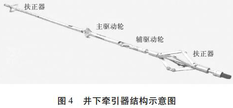 水平井注水井注入剖面测井工艺原理如图 3 所示。在垂直井段,仪器在重力作用下可以通过注入管柱下入到井内,注入管柱下端须装有喇叭口,且喇叭口应在造斜点以上,保证测井完成后仪器顺利起出,不发生卡仪器问题。仪器通过喇叭口以后在重力作用下继续向下移动,当仪器不能靠重力下移时,启动牵引器,利用牵引器将仪器推送到井底,上提电缆过程中进行测井。