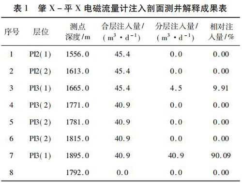 2017 年 9 月在大庆油田采油八厂肇 X - 平 X 水平井注水井中*次进行了水平井注入剖面测井现场试验。该井斜深2 055. 42 m,水平段长度为568. 46 m,试验目的是通过注入剖面测井了解该井各层段的注水情况,同时对水平井测井工艺、仪器的适用性、井下牵引器及井口辅助装置等设备的工作有效性和可靠性进行评价。现场试验中,在密闭条件下录取到了该井的注入剖面测井资料,进行了重复测量,重复测量结果在误差允许范围内,测井成果见表 1。该井施工压力 6. 0 MPa,注入量45. 4 m3 /d,有 7 个射孔层,分 8 个测点测量,2 个层有吸入显示,其中,P13( 1) ( 1 734 ~ 1 767 m) 层绝对吸入量4. 5 m3 /d,相对吸入量为9. 91 %,P13( 1) ( 1 899 ~1 943 m)层绝对吸入量 40. 9 m3 /d,相对吸入量为 90. 09% ,测井成果见表 1。通过与甲方的交流,再结合该井的动静态资料及周围井的工作状况,采油厂的地质人员认为本次测井结果能比较准确地反映该井的注入情况。