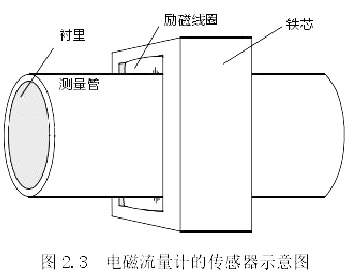 传感器的主要作用是将通过管道的流量信号进行转换,将其转为电动势。市面上常见的传感器主要有下图 2.4 中如测量管、铁芯、励磁线圈、衬里等结构。