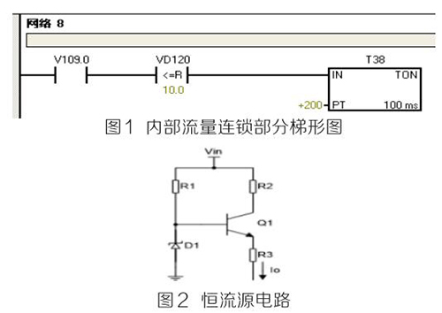 (2)PLC及模块。PLC及模块是自动化控制系统主要设备,且PLC及模块属于高集成高精密电子设备,保持室内整洁舒适,可以提高自动化系统运行稳定性。PLC及模块硬件运行可靠,内部控制程序是其控制核心软件,如PLC硬件出现故障或损坏一般直接更换,但原内部控制软件无法上传,整个控制系统成失控状态。所以其内部控制程序在调试验收合格后应及时备份并做好标记,为以后修复PLC故障提供保障。PLC系统的维护技术人员需掌握一定基础PLC控制逻辑原理,对准确判断PLC故障点有很大的帮助。例如选矿厂水泵房S7-200系列PLC自动抽水系统出现如下故障 :触摸屏能控制变频器启动水泵抽水,但在短时间内会自动停泵,导致无法正常抽水。通过故障现象可初步判断PLC及模块硬件设备正常,主要由于某个变量有问题导致连锁停机。打开备份PLC控制梯形图程序进行相关分析,原来是氨水计量表瞬时流量数值做了连锁,其在一定时间内瞬时流量不大于10m 3 /h时,自动停泵,电磁流量模拟量输出电流值仅为4ma且无变化,确定氨水计量表有故障。可临时应急维修,模拟量模块输入模拟电流值10ma~20ma之间一固定数值即可恢复正常运行。制作简单恒流源电路代替氨水计量表输出的模拟电流量,实现解决水泵无法正常运行的故障。