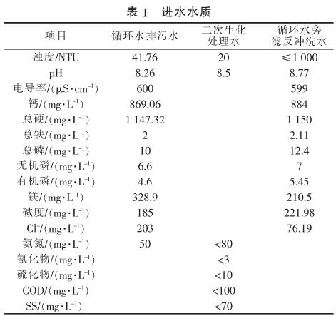由表1可知,循环水排污水浊度较高,硬度大,主要是钙盐、镁盐含量较高;二次生化处理水是经现有的生化处理系统处理后的气化灰水、冲渣水等废水,其氨氮、COD需进一步去除,以利于后续脱盐处理系统的运行。