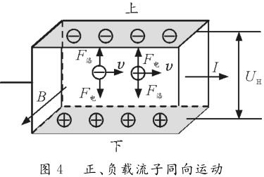 情形2:正、负载流子反向运动。如图3所示,长方体玻璃水槽中盛有NaCl的水溶液,水槽左、右侧壁内侧各装一导体片,在溶液中通入水平向右的电流,匀强磁场B垂直纸面向外。NaCl溶液中既有正离子,又有负离子,根据左手定则可判断正离子受到向下的洛伦兹力,故向下运动并堆积。同理,负离子也受到指向下的洛伦兹力,也向下运动并堆积。由于正负离子均向下侧面堆积,故上下两侧面的电势均为零,但下侧面处离子浓度大于上侧面离子浓度。