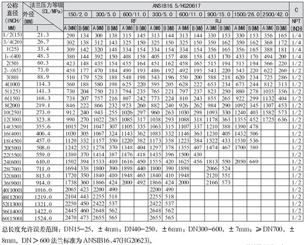 连接法兰压力等级(CL/MPa):150-2500/2.0-42.0、PN0.25-25.0