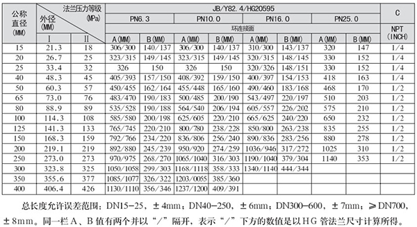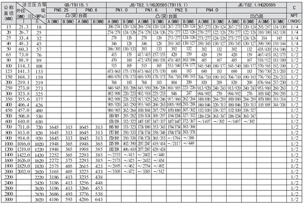 2.尺寸表中同一栏值有两个并以/隔开,表示/下方的数值是以HG管法兰尺寸计算所得。
