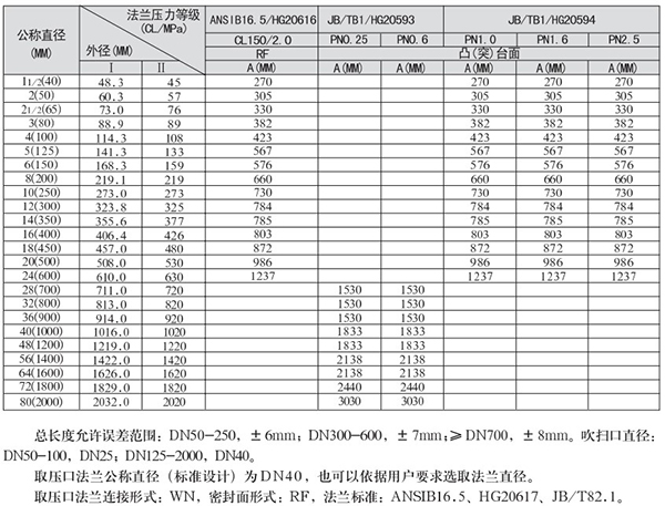 1.总长度允许误差范围:DN50-250,±6mm;DN300-600,±7mm;≥DN700,±8mm。吹扫口直径:DN50-100,DN25;DN125-3000,DN40。
