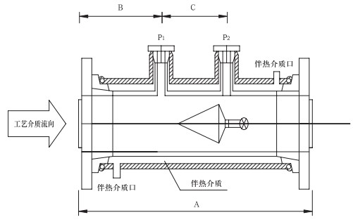 专门为测量要求夹套管伴热工艺介质的流量而设计,特别适合易结晶介质及温控要求严格的场合。钢制夹套管法兰标准:SHT501-1997。