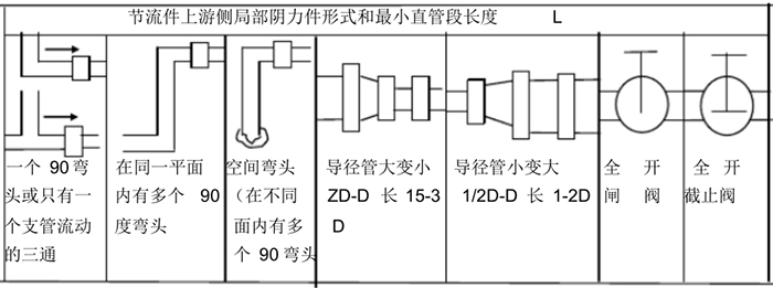 节流装置的安装和适用于下列管段和管件有关:节流件上游侧*一阻力件、*二阻力件,节流件下右侧*一阻力件,从节流件上游*二阻力件到下游*一阻力件之间的管段以及差压讯号管路等。