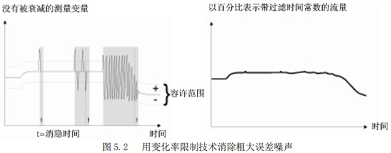 “变化率限制值”与“不敏感时间值”是用来消除某些增加阻尼不能除去的噪声。它能够从真实的流量信号中判别出阶跃信号引起的噪声和浆液尖状噪声。这种判别是以变化率的限制和持续时间为依据的。图 5.2 所示为使用变化率限制技术去除粗大误差的原理说明。该功能为在前面采样中获得的流量数据经一阶滤波后的,设定某一上限和下限(变化率)。如果当前采样的流量数据超过或低于这个*限值,而且在超过或低于这个*限值的变化时间之内,则认为这种变化是由于噪声所引起的,CPU 予以切除;而当超过或低于这个*限值的变化在设置的不敏感时间以外,则认为这种变化是由于真正的流量变化所引起,CPU 就认可是测量流量的变化。