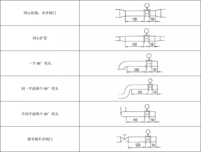 *先注意传感器本身不能作为荷重支撑点,它不能支撑比邻的工作管道,应有夹持它的管道承重。为获得正常测量精确度,电磁流量传感器上游也要有一定长度直管段,但其长度与大部分其它流量仪表相比要求较低。90º弯头、T形管、同心异径管、全开闸阀后要离传感器进口端法兰连接面5倍直径(5D)长度的直管段,不同开度的阀则需要10D;下游直管段为(2~3)D;但要防止蝶阀阀片伸入到传感器测量管内。各标准或检定规程所提出上下游直管段长度亦不一致,汇集如下图所示,要求比通常要求高。这是由于为保证达到当前0.5级精度仪表的要求。