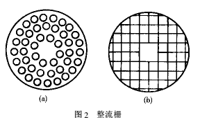 图2为圆孔和方孔两种形状整流栅,整流栅直径为100mm,宽为15mm。方孔流通面积约为圆孔流通面积的4/3。中间实体为固定整流栅螺钉位置。