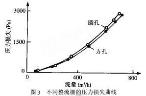 图3是只改变整流栅条件下,流体经过流量计的压力损失曲线。由图知,尽管方孔整流栅比圆孔增大了万方数据的通流面积,但对流体压损的影响并不明显。在小于300m³/h的范围内,两者几乎没有差别,在Q=700m³/h处,方孔整流栅*大使压损降低300Pa,比圆孔整流栅改善约10%,在工作范围60~600m³/h内,方孔比圆孔平均改进约2%,但方孔加工难度大于圆孔,因此,应根据实际情况选择整流栅。