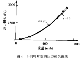 本文在允许范围内分别选择13和20个叶片数的叶轮进行了测量,结果如图4所示。可看到,两条曲线几乎重合。说明在允许范围内,叶轮叶片数的增减对压力损失的影响可以忽略。但采用13叶片数的叶轮时,测得流量计起始流量为6.5m³/h,而采用20叶片数的叶轮,其起始流量为5.5m³/h,适当增加叶片数,可以较明显地提高流量计的灵敏度。值得注意的是,增加叶片数会使重叠度增大,过大的重叠度将使流量计性能恶化。
