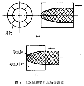 图5(a)、(b)分别为全封闭和半开式两种结构的后导流器示意图。导流叶片数均为8,内导流体几何形状为椭球形。两者不同之处在于全封闭式导流叶片由导流器进口延伸至出口,而半开式导流叶片则由导流器中间起到出口处。