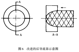 作者在半开式基础上设计加工了另一种改进的后导流器:把半开式叶片部分缩短一半,同时将叶片数减少为4,在原无叶段增加与有叶段数目相同位置均匀相错的叶片,但不加外筒。目的是尽量在不增加摩擦和阻塞损失情况下,加强对经过叶轮后旋转流体的整直作用。如图6所示。