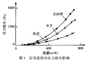 图7为分别采用三种后导流器而其余部件不变条件下流量计的压力损失曲线。由图可知,在流量为0~100m³/h范围内,三种结构的压力损失均很小,可以认为压力损失在小流量工况下对几何结构不敏感,即后导流器的几何形状变化还没有对压损产生影响。随着流量的增大,三条曲线明显拉开了距离,其中全封闭式压损增长*快,半开式次之,压损*小的是改进式,在额定*大流量600m³/h处,改进式压损仅为700Pa,约为半开式压损的1/2,为全封闭式压损的1/3。当流量进一步增大,这种差距还将随之增加。由此可见,选择合适的导流器可以大大降低流量计的压力损失。在流量计的工程应用中,有必要对前、后导流器几何参数进行优化,以达到*小压损目的。