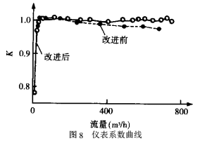 由图8可看出,采用改进的后导流器后,流量计仪表系数比改进前有较好的改善,在量程范围内(60~600m³/h),K很好地体现了系数的特性,甚至在超过*大量程后,能继续保持水平直线状态。改进前的流量计K值也较好,但随着流量增大,直线略向下倾斜,偏离了水平位置。