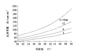 (2)可见,对确定的涡轮流量传感器,易知口径D大,K。值小;叶片数n大,K。值大等。如果要获得较大的仪表常数,就一要对涡轮传感器的结构参数进行优化设计,从图(2)可以看出,叶片高度h增加,K。增大;导程角增大,K。增大。对于φ19的过环空大排量涡轮流量计而言,由上式计算得K。=74.567rpm/m³/d,而水中标定的Kw=78.89rpm/m³/d,表1给出不同口径和不同导程角下涡轮流量计固有仪表常数的计算值。