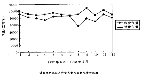 服务站封闭计量就是在该服务站管辖的所有调压站均安装计量表。比如京津服务站有车辆厂、扬桥、白庙、席场4个调压站和1个调压拒,上述站、拒装计量后就成为封闭计量。封闭计量使服务站有了考核本站上万户用气量的总计量表,从而可明显知道本站的供销差封闭计量的重要意义和它能产生的经济效益,目前尚不能从已投人l0万元资金刚开始试验运行的京津站得到论证(但到今年底会有确切结论),目前可以引用97、98年原河北所谦益里调压站的计量统计资料来简单说明它的重要意义。(见下图及文后附统计表)