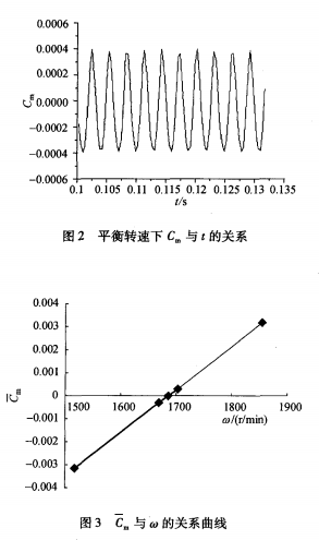 图2即为叶轮在平衡转速下旋转时Cm的周期性变化过程。假定Cm为Cm值在一定计算时间内的平均值,计算时问通常约为一个叶轮轴的旋转周期。通过计算发现,Cm基本上与叶轮转速呈线性比例关系,见图3。Cm等于零所对应的ω则表示叶轮在此转速下旋转达到了力矩平衡。因此在实际计算中,可以选取两个转速进行计算,建立Cm与ω的线性关系,然后利用此关系确定叶轮的平衡转速。当然,预先能对叶轮处于平衡状态下的转速进行估计,缩小设定转速与平衡转速的范围,利用这种方法确定叶轮平衡转速的精确度将更加高。