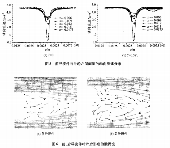 1)前导流件叶片后的尾流影响进入叶轮入口流体速度分布,也是导致合力矩系数Cm**问发生变化的主要原因,从而影响叶轮的旋转特性。