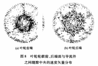 由图8可以看到,叶轮轮毂前、后端面与导流件之间缝隙中的流体受叶轮旋转的影响而具有明显的圆周运动。